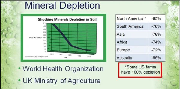 We can no longer obtain the minerals & vitamins necessary to neutralise the toxins our bodies normally produce in metabolic processes and together with all the other compromising toxins building up in our bodies, such as antibiotics, synthetic hormones, preservatives, fluoride, aspartame, sugar, vaccines etc, that have accumulated over our life time creates a ticking time bomb.